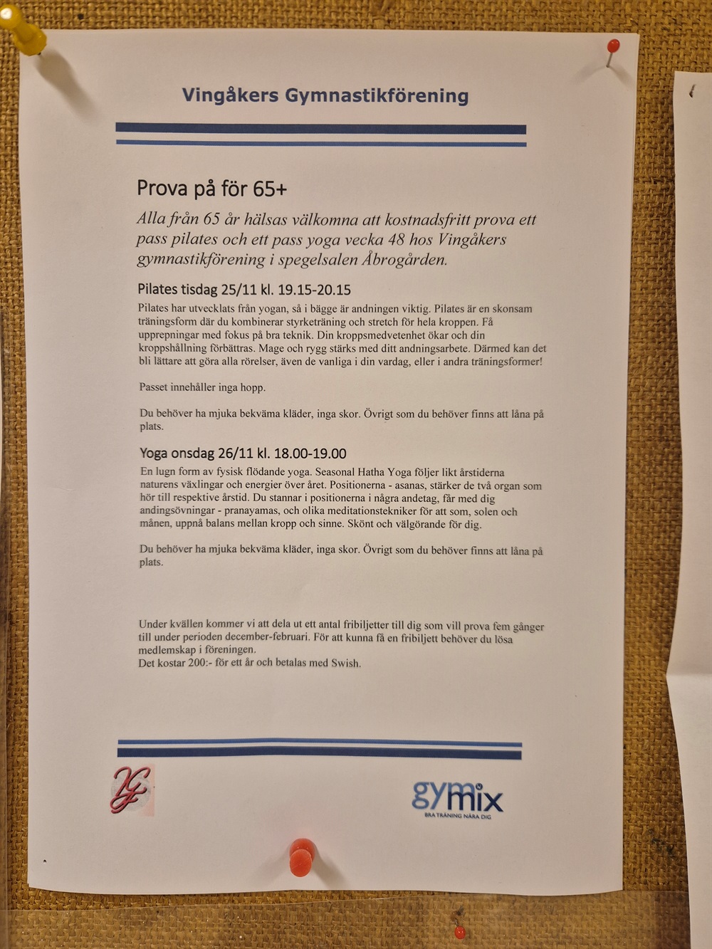 Vecka 48 erbjuder vi alla 65+ att prova på yoga och pilates gratis. Passen hålls I Spegelsalen på Åbrogården.